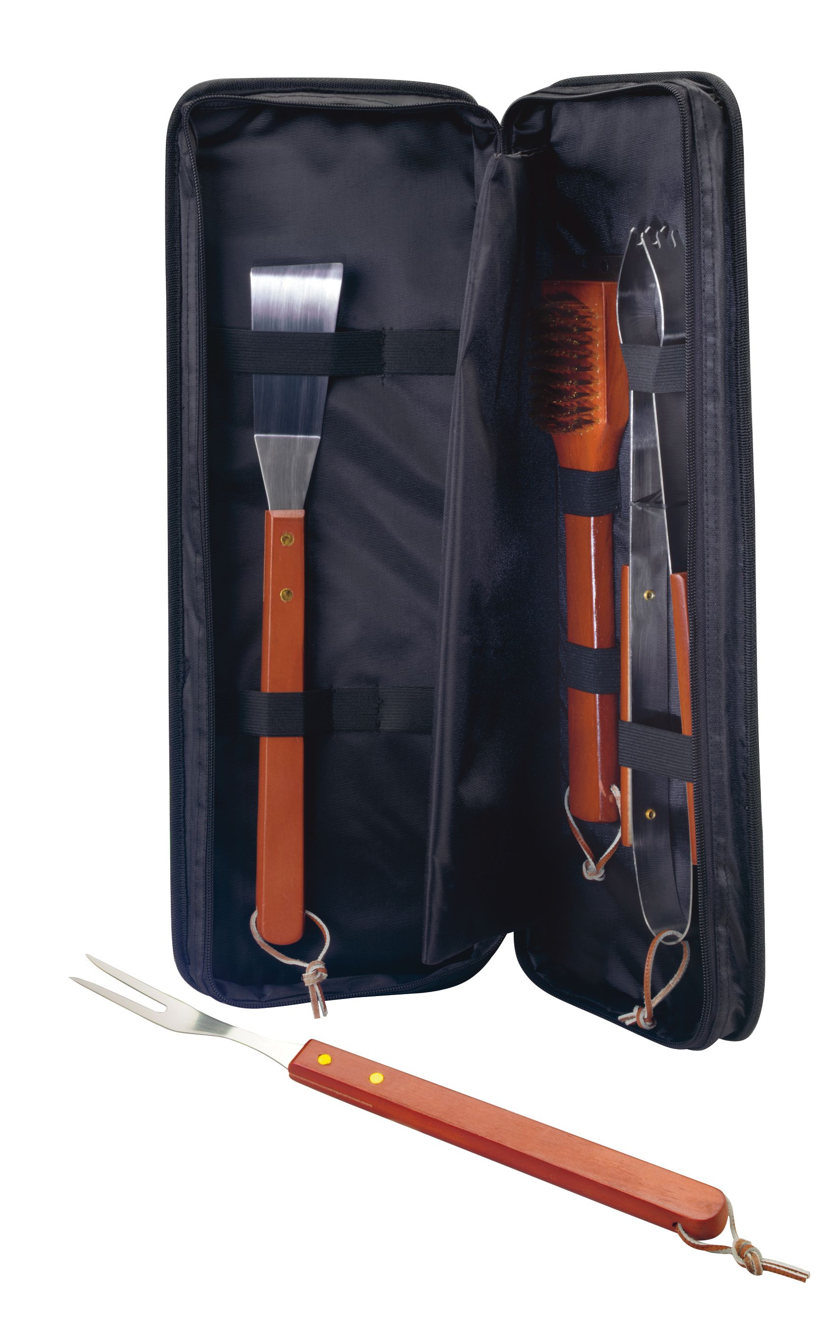 Includes spatula, fork, tongs and grill brush