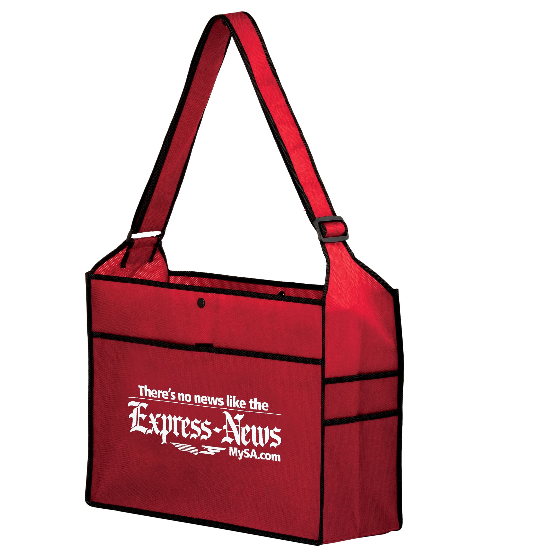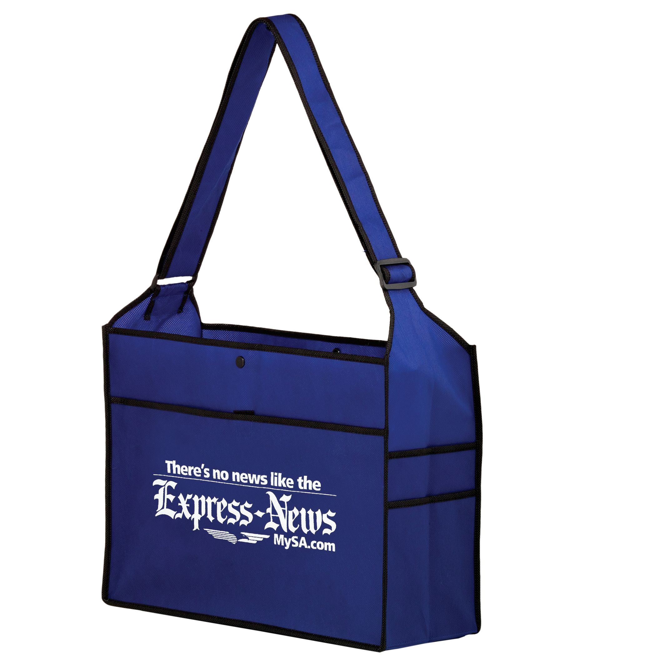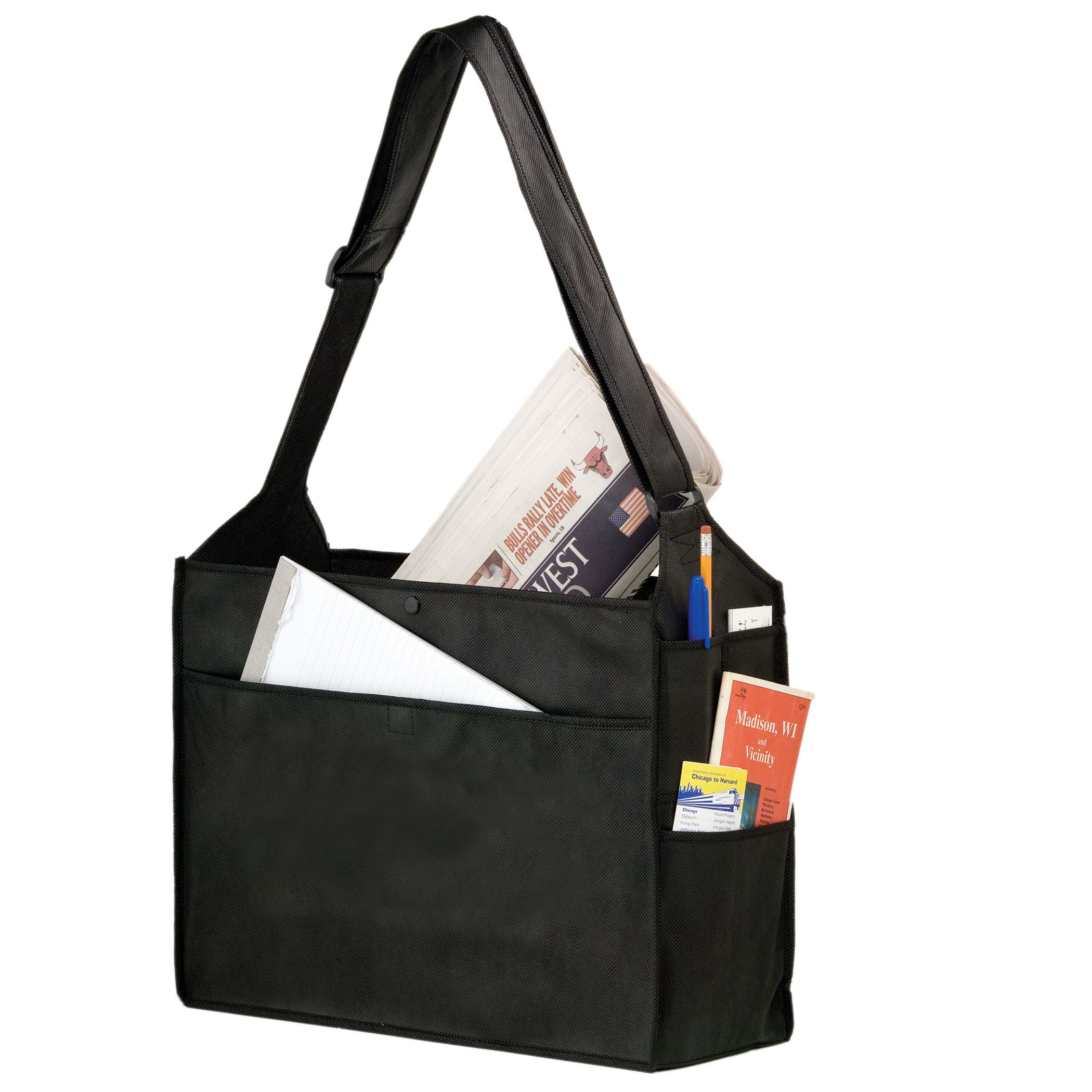 - Get carried away with this essential promotion! Our Y2K non-woven polypropylene essential tote bags are perfect for everyday people on-the-go. Measures 16” x 14” with 6” gussets and an adjustable shoulder strap. Two business card pockets are featured for easy networking. Includes a side pocket, easy access document pocket, and Hook and Loop strips for closures on the main compartment and front pocket. Imprint options available on the bag’s front or back.