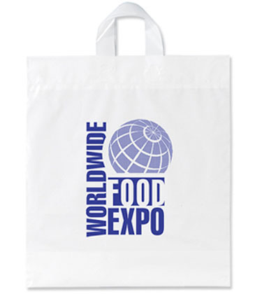 - 3.0 mil plastic bag with soft loop handles, reinforced fold-over tops, and bottom gusset.