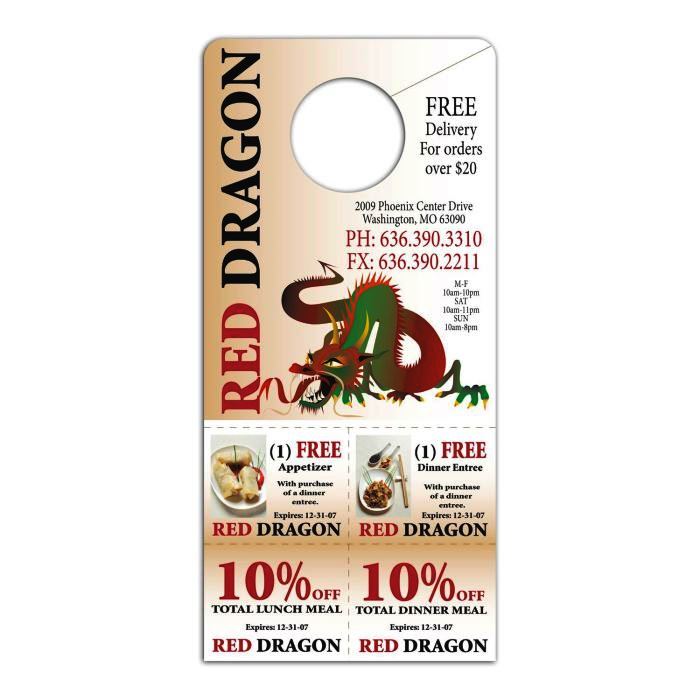 - Open the door to business relations by promoting your best deals on this door hanger! Measuring 3 3/4 x 8, this hanging advertisement is made from 12 pt. paper with lamination. Features include coupons with cutout lines (coupons are perforated and dotted lines do not print)- great for restaurants and other businesses with current specialty services. Customize with a four color process imprint and hand out to bring awareness to your brand name! Always-in-stock Item!