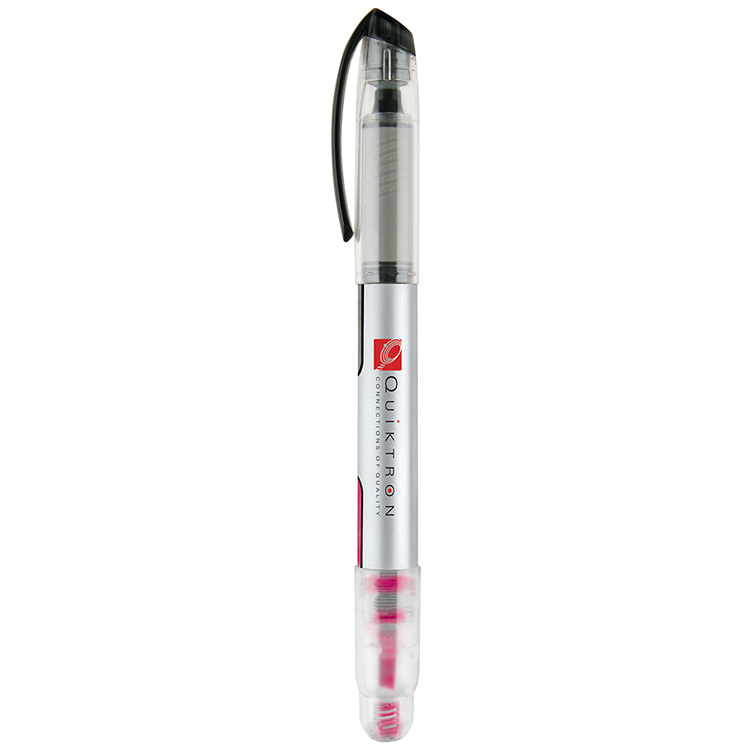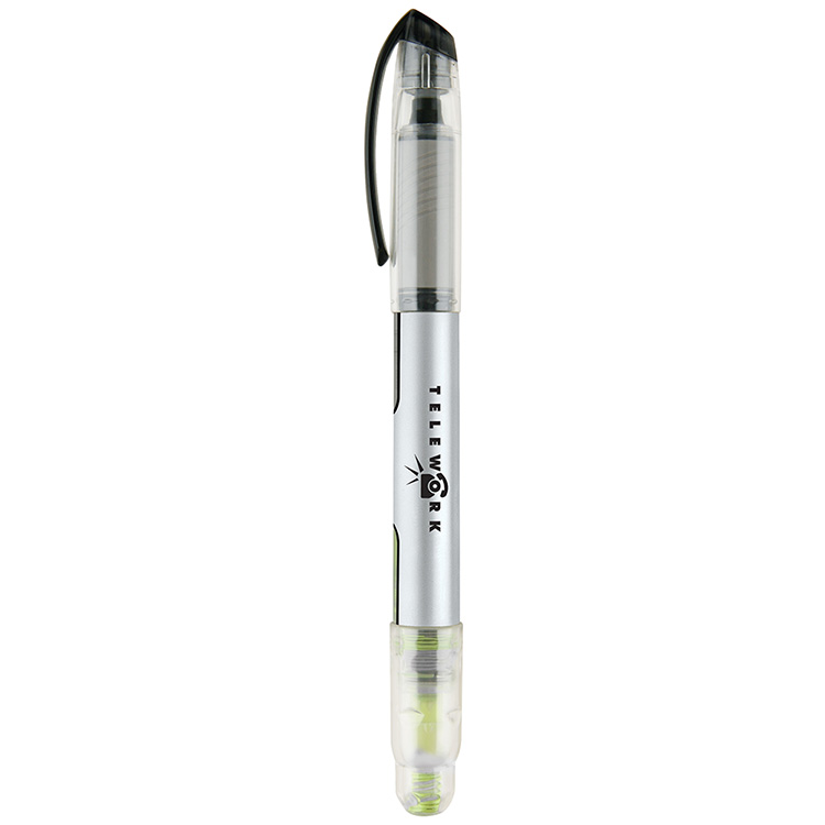 - Double-ended plastic rollerball pen and highlighter. One end includes a smooth-flow black rollerball pen, the other contains a neon liquid highlighter. Sleek clear barrel with silver wrap and gray and black accents.