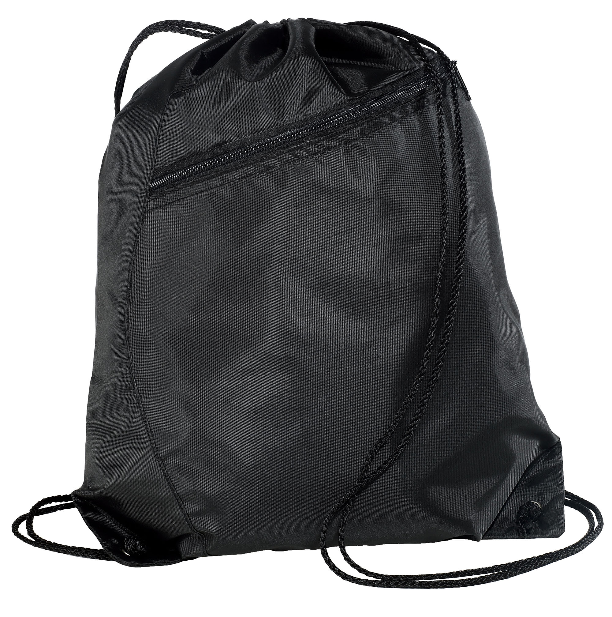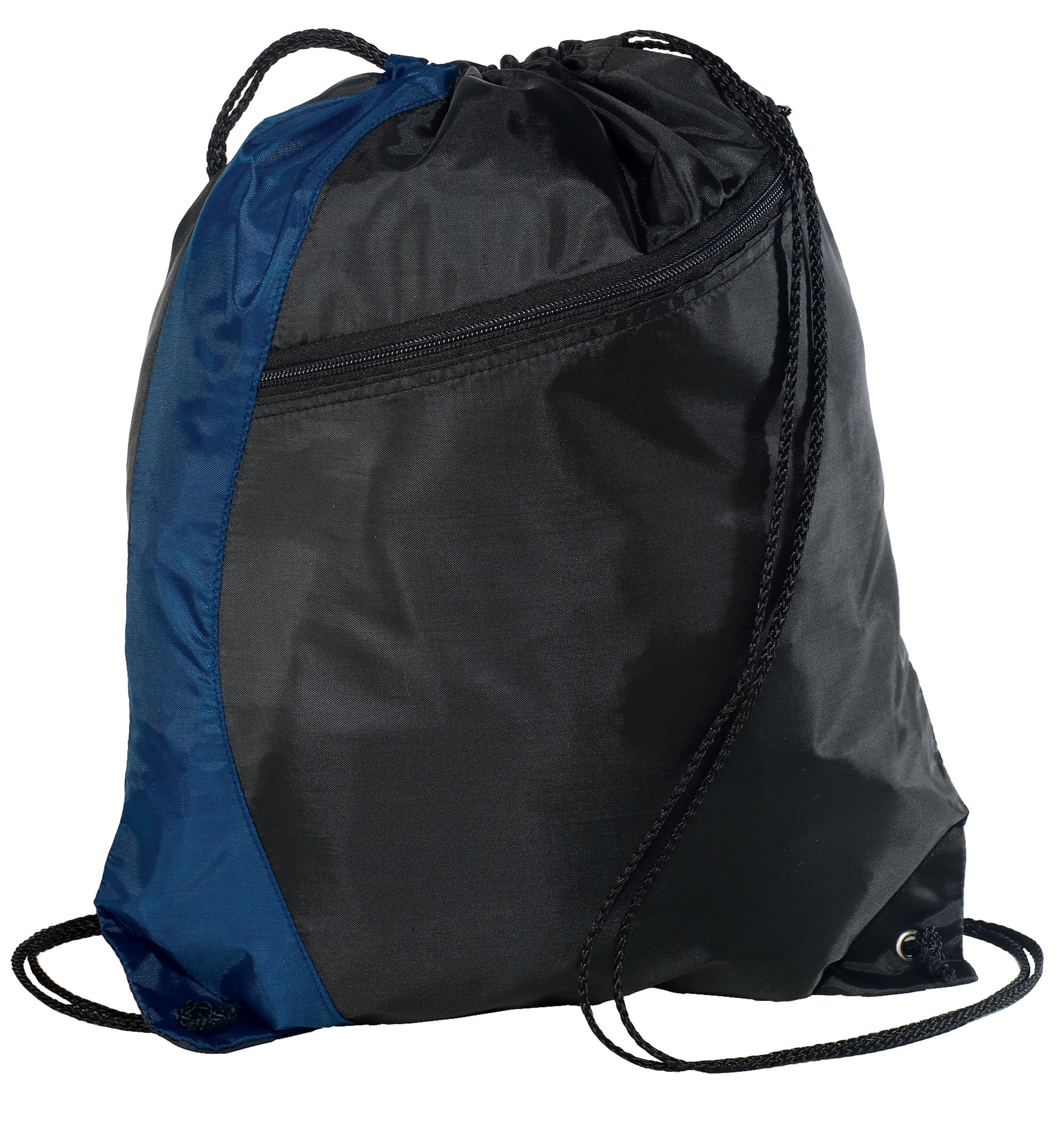 - Colorblocking and an asymmetrical zippered front pocket give this cinch pack distinctive character.