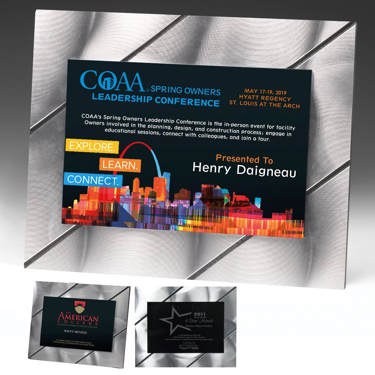 - These Visionary Plaques combine a black acrylic panel over a decorative swirled metal with geometric design to form a modern and unique recognition statement. Choose a Laser Engraved, Screen Printed or 4 Color Process Imprint on the black acrylic panel.?