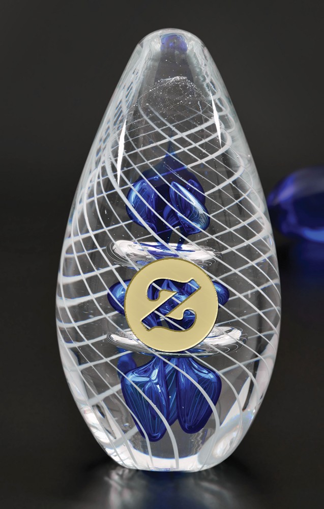 - Beautifully stylized art glass award with swirls and an inner blue motif.