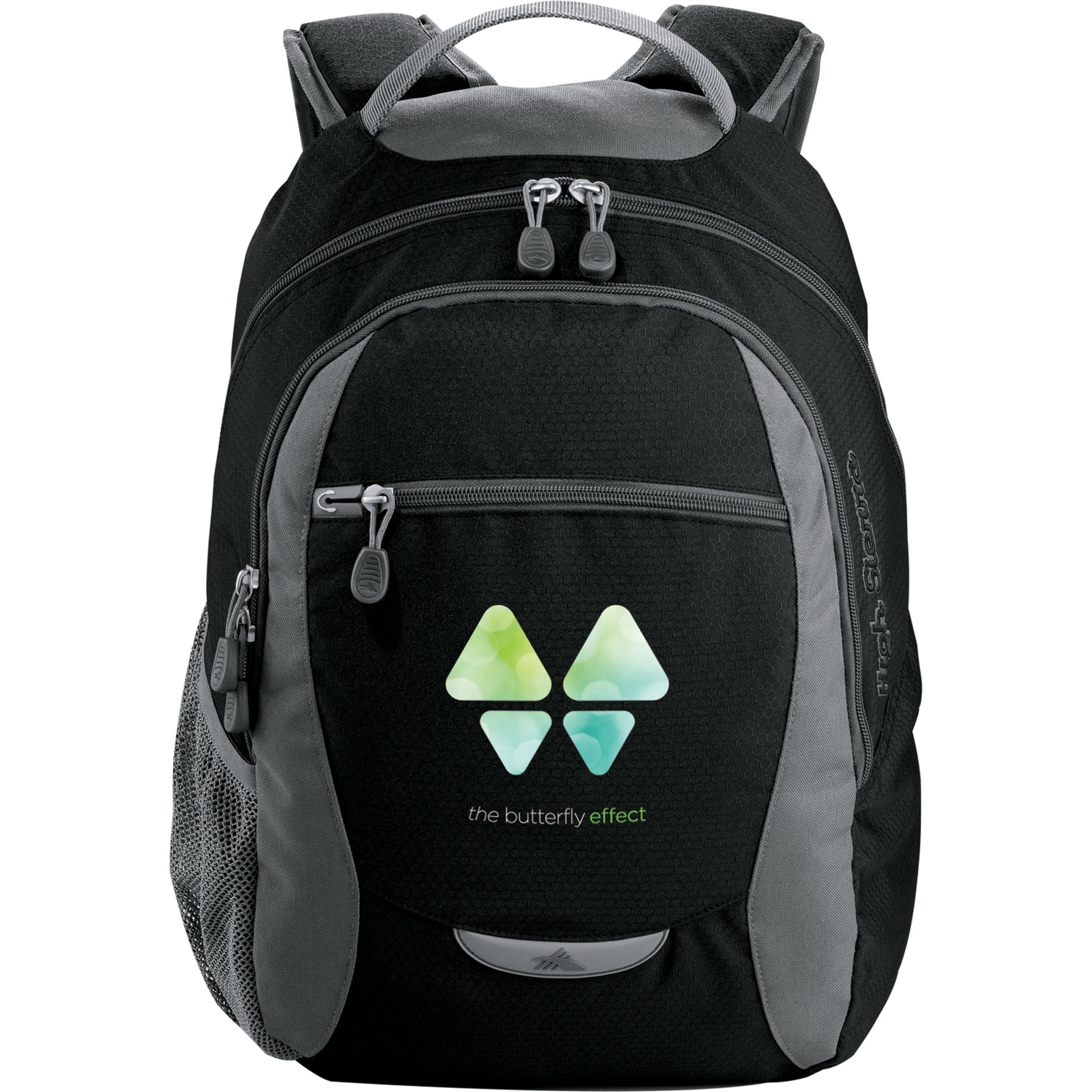 - With a spacious, front-loading main compartment and an additional organizer compartment, the High Sierra Curve Backpack is designed for convenience. Its front zippered accessory pocket includes a headphone port and provides you with additional storage, while its gusseted side mesh pockets hold water bottles for on-the-go hydration. The Curve Backpack has a padded back panel and cushioned shoulder straps with a built-in smartphone pocket. Wear the backpack using the comfortable straps, or carry it easily using the heavy-duty grab-handle.