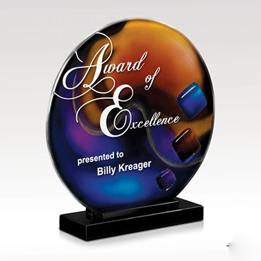- Alluring colors of blue, amethyst, and amber art glass define the Trilogy Sphere with its black glass base . What a lovely backdrop for your words of congratulations and gratitude.