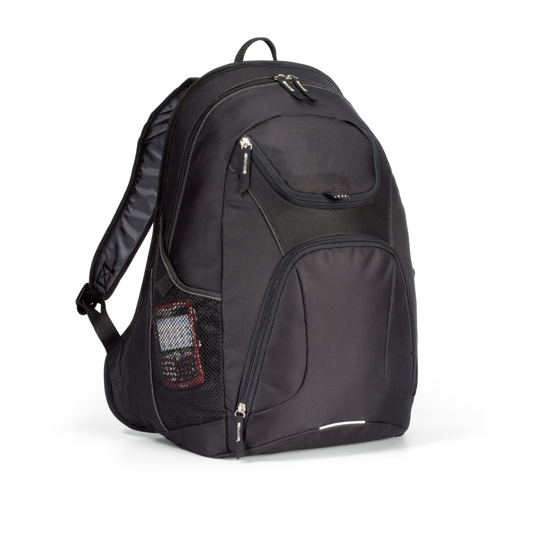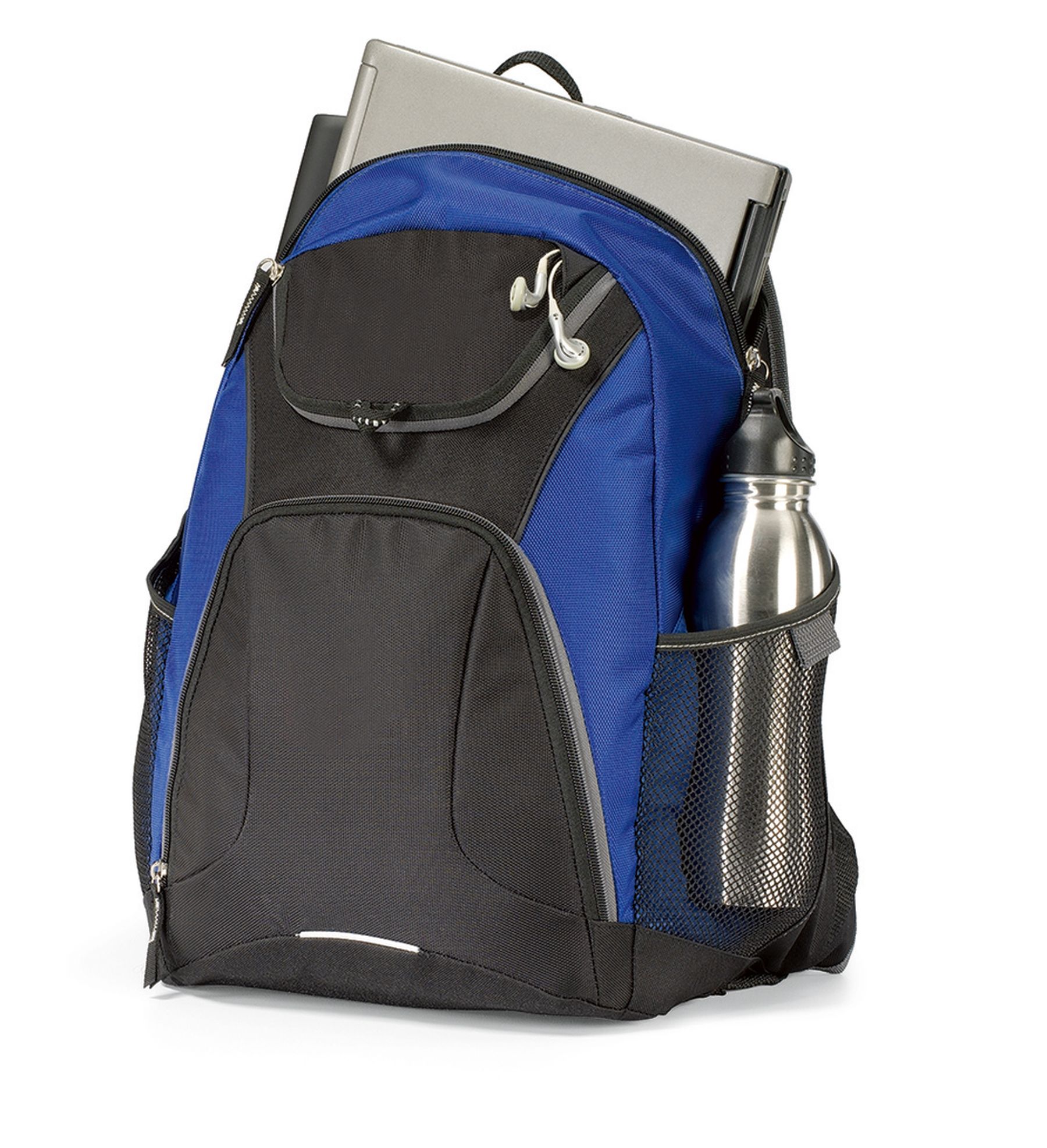 - Your quest for the perfect computer backpack ends here! Made of polyester, this backpack includes a large main compartment with padded computer sleeve (fits up to a 15 laptop) and mesh pockets. Other features include a front pocket with multi-function organizer, a zippered pocket with earphone outlet, side mesh pockets and padded, adjustable shoulder straps. Add a company logo, name or custom design to make this a one-of-a-kind promotional gift!