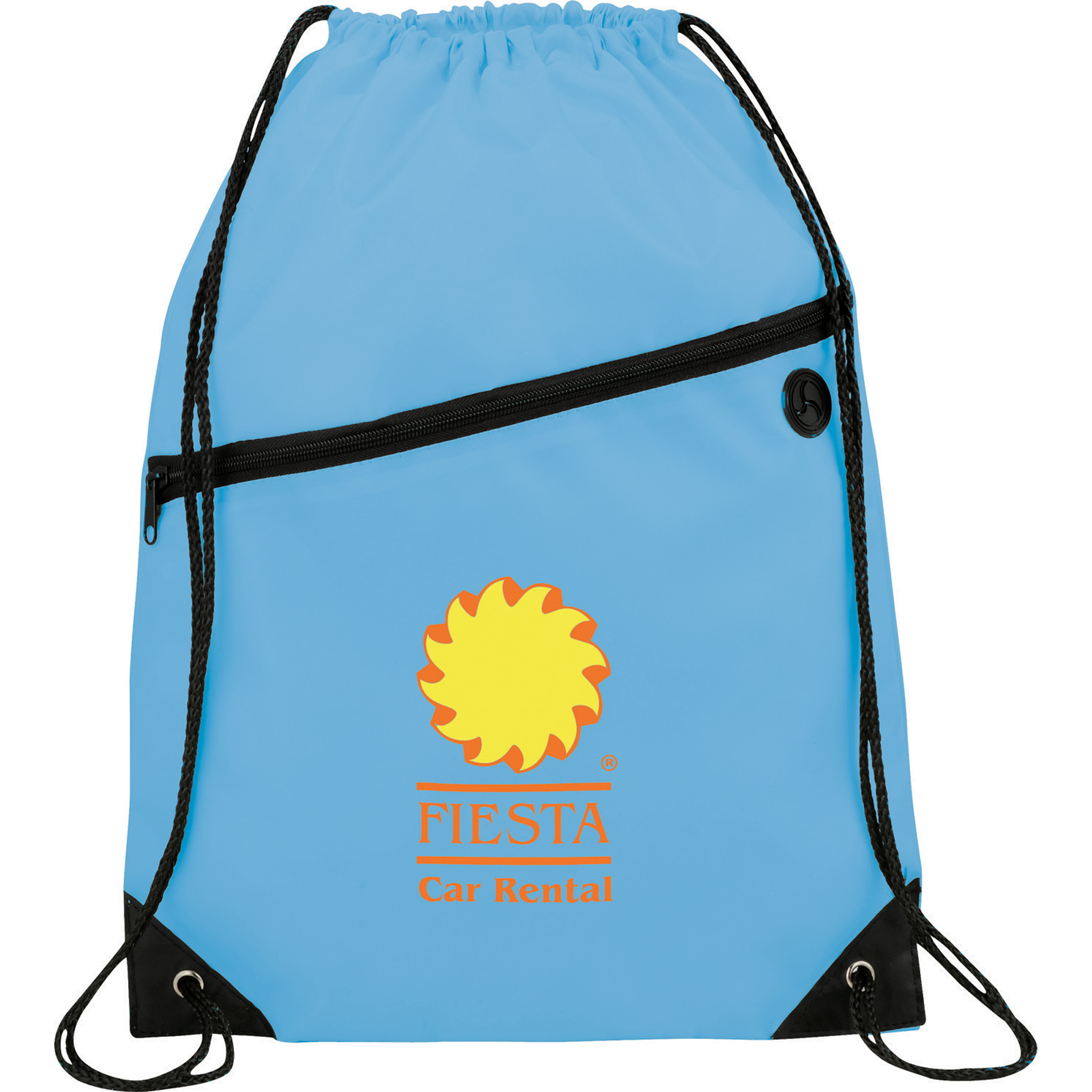 - The Robin Drawstring Bag has a large main compartment with a cinching rope closure. This specialty drawstring bag includes a zippered front pocket with an earbud port and reinforced corner tabs.