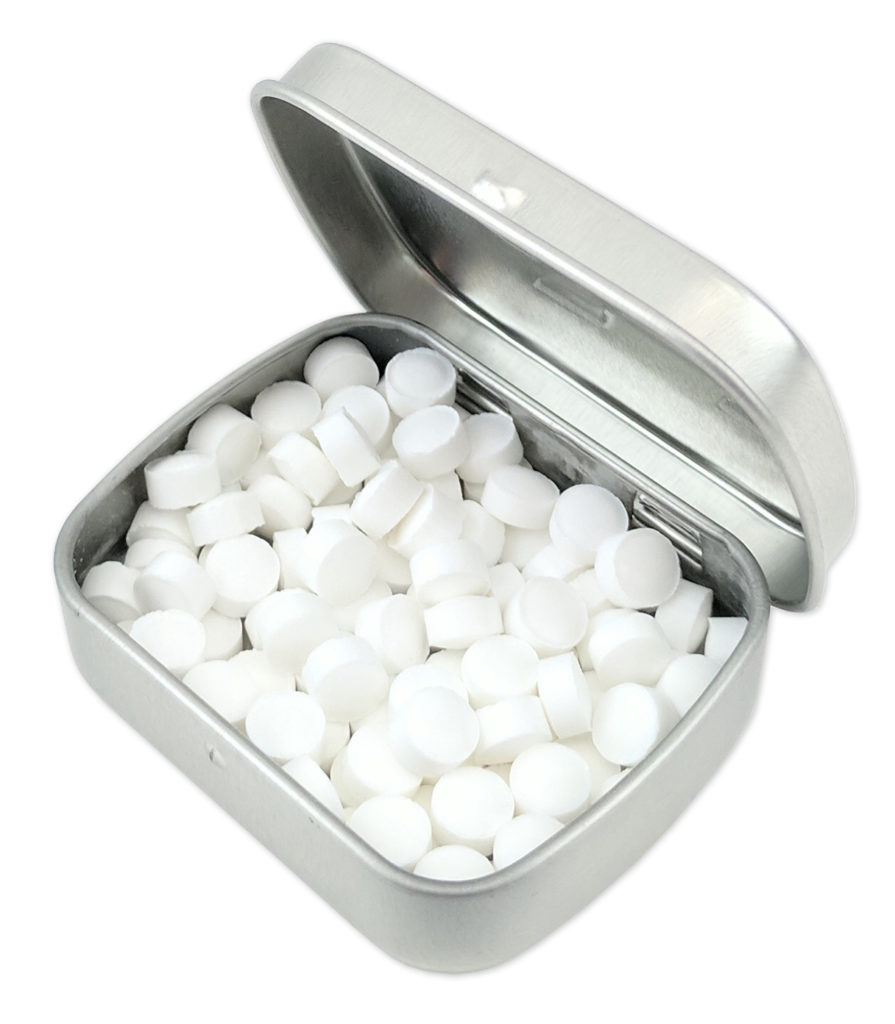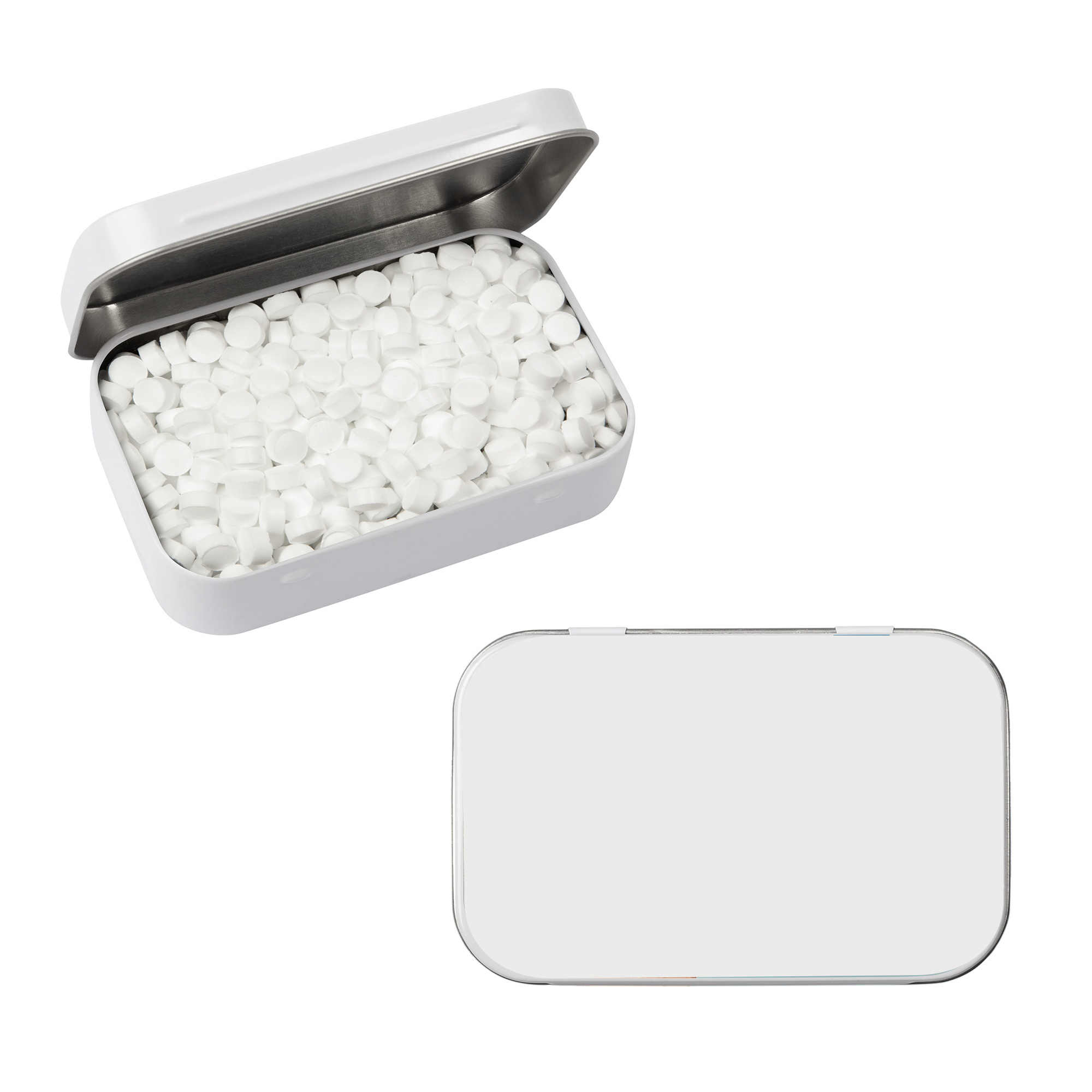 - Think of the possibilities with this versatile tin that offers a huge imprint area vertically or horizontally. For your next promotional event or giveaway; create a photo-quality image in full color that everyone will appreciate. The rectangular shaped tin opens to 2 oz. (56 g) of refreshing sugar-free MicroMints®. After the food has been enjoyed, the recipient is sure to find many uses for this handy sized keepsake. The tin is recyclable and shrink wrapped for your safety. Non melt product. Peppermint will be provided unless specified otherwise on order. Dimensions: 3 3/4" x 2 3/8" x 3/4".