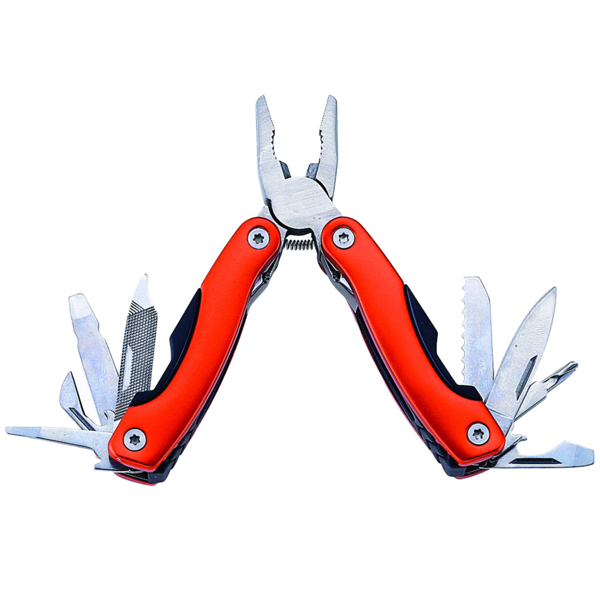 - 2 1/2" closed. Anodized aluminum handle with stainless steel implements. Features include spring action stainless plier jaws, blade, saw, file, flathead and Phillips screwdriver, bottle/ can opener, reamer and much more. Available in Orange and Black. Packaged in aluminum gift box with see-through top which makes logo visible when the tool is in the packaging.
