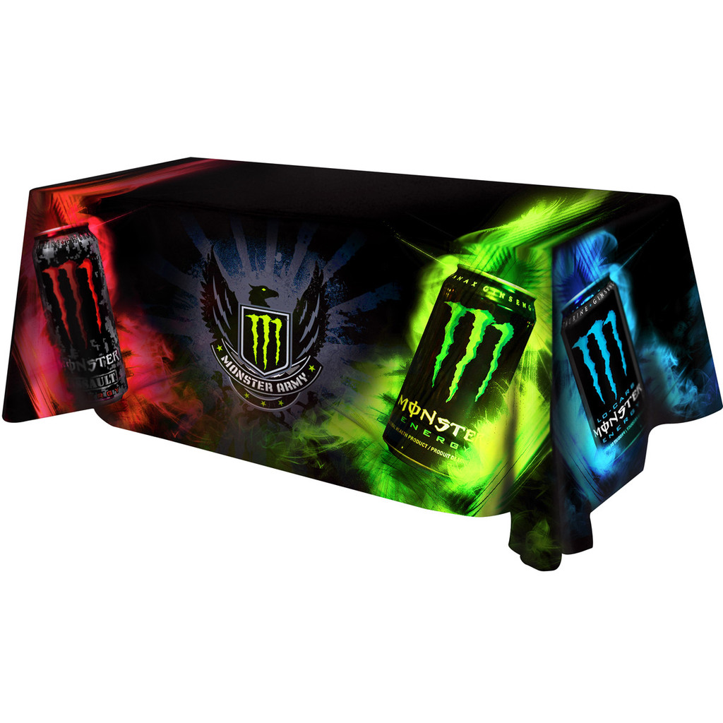 - Covers four sides of an eight foot standard table. All Over Dye-Sub imprint only available on white polyester base color table cover. Premium quality polyester table drapes. They are washable, flame resistant and easy to store and ship. Includes rounded corners. Table throw drapes the top, sides, and back of 29" high tables. Differences may occur in fabric weight, fabric finish, color and overall size of the finished product. These variations are considered acceptable. Fits Table Size: 96" (w) x 29" (h) x 30" (d). Made in the USA with global components.