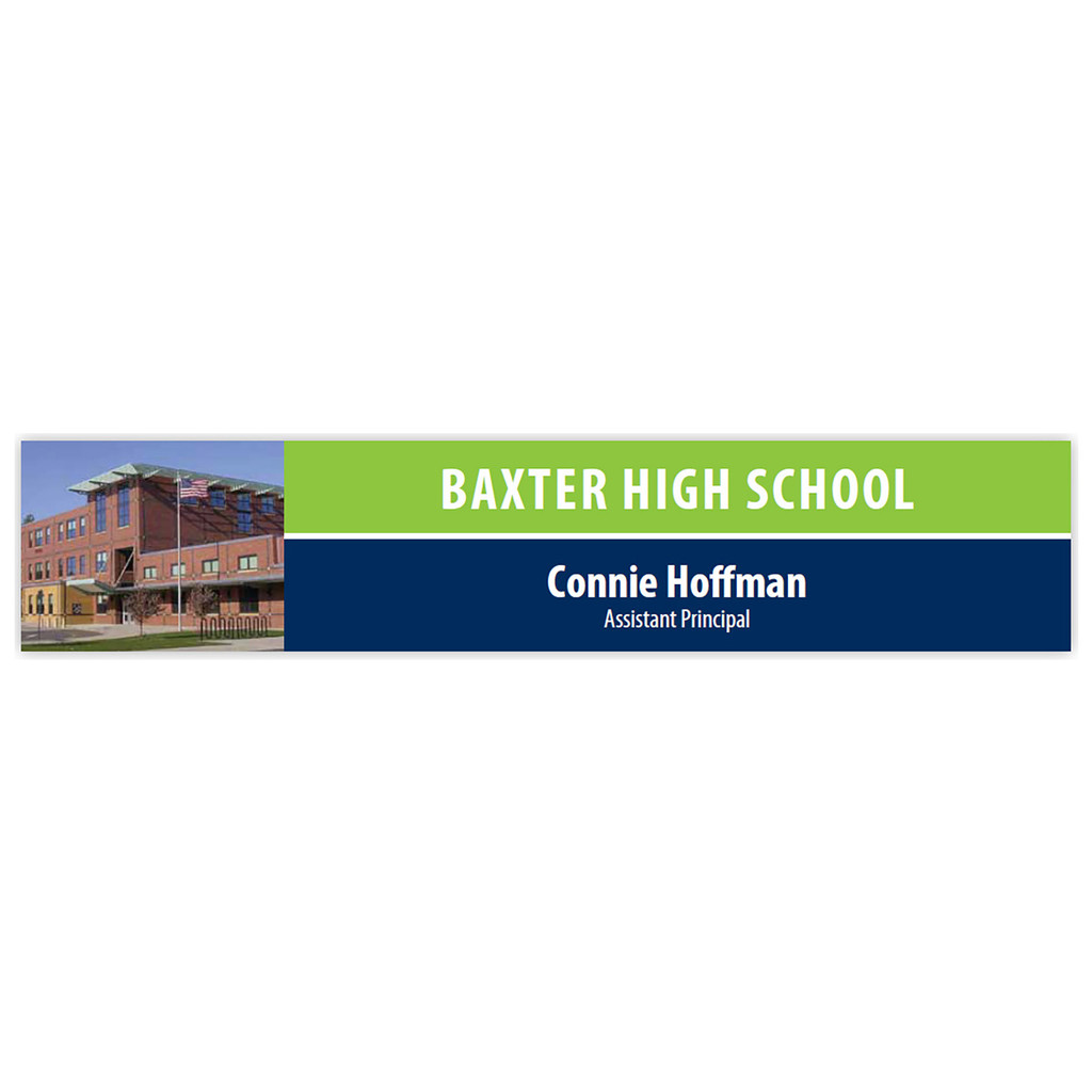 - Identify your staff and give room locations with these personalized, high impact, full color desk or wall name plates. The base cost includes square corners, full color imprint, and up to three lines of printed personalization. Additional upgrade options such as round corners and attachments are available to meet your workplace needs. Utilize our Badge Warehouse program to order in bulk and release as needed. USA Assembled.