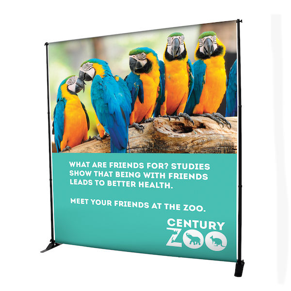 - This display features an adjustable frame so it can showcase a variety of banner sizes.