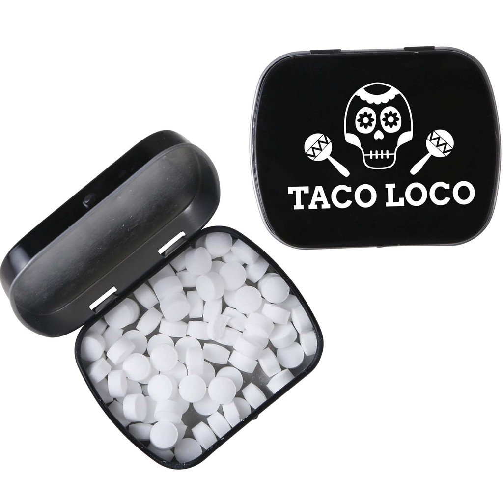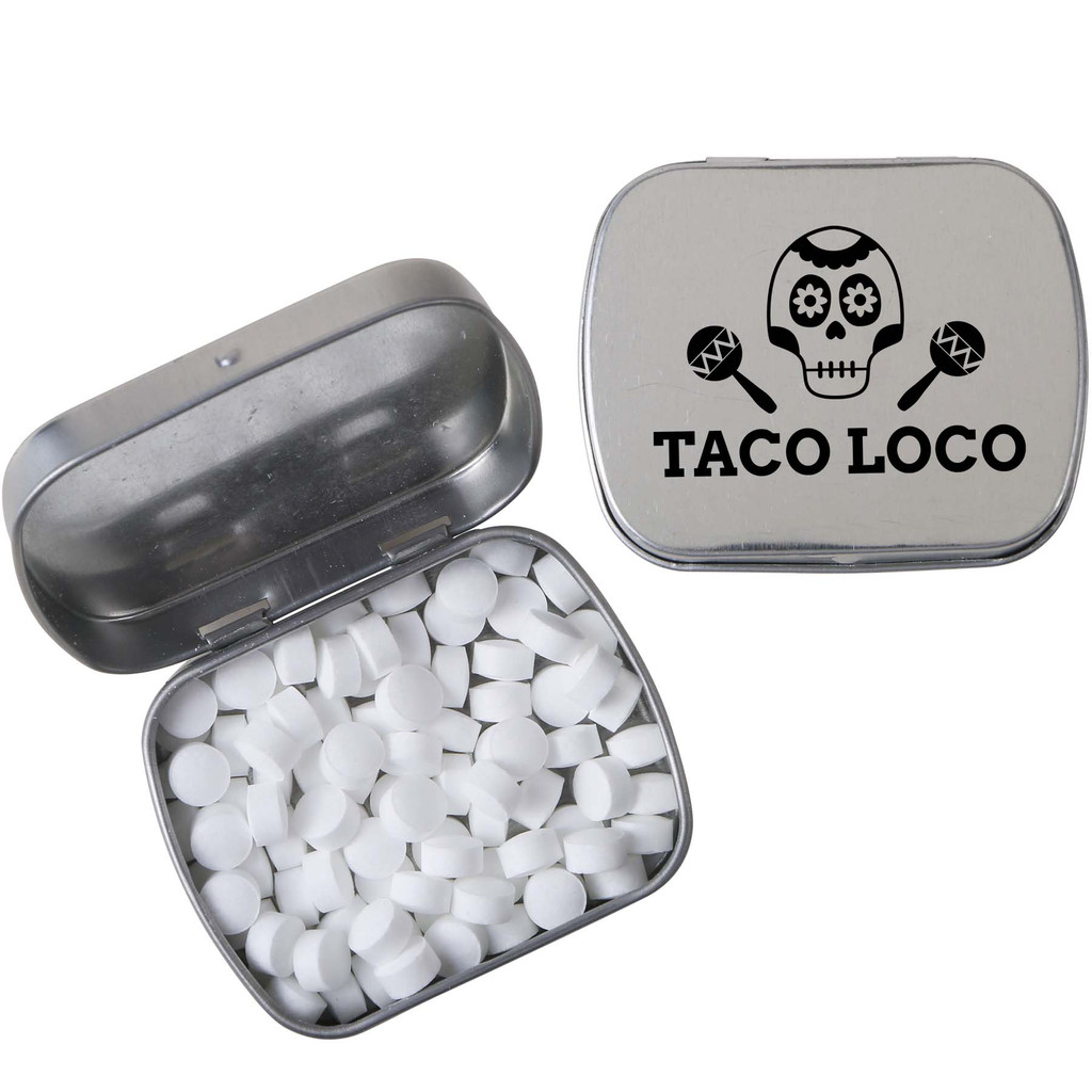 - Serve up something good to go in these totally tote-able tins! Each 2 1/2" x 2" rectangular tin has a hinged lid and is available in a selection of base colors. Once filled, each is shrink-wrapped for tamper-resistant giving. Add your school, sports team, organizational or company logo, emblem or message to customize. Makes a dynamic gift or giveaway at grand openings, seminars, trade shows, conventions, product launches and social or marketing events and activities.