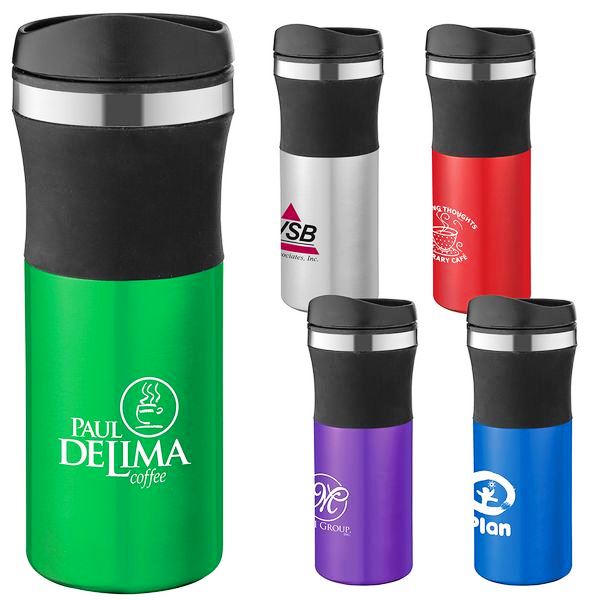 - 16 oz. Stainless steel outer wall with bold metallic color finish; double wall insulation with plastic liner; shiny chrome accent; black rubber center band detail for easy-grip; black plastic twist-on lid with slide lock prevents spills; non-slip bottom. Not microwave or dishwasher safe.