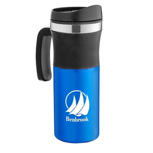 - 16 oz. Stainless steel outer wall with bold metallic color finish; double wall insulation with plastic liner; shiny chrome accent; black rubber center band detail; sturdy black plastic handle for easy grip; black plastic twist-on lid with slide lock prevents spills; non-slip bottom. Not microwave or dishwasher safe.
