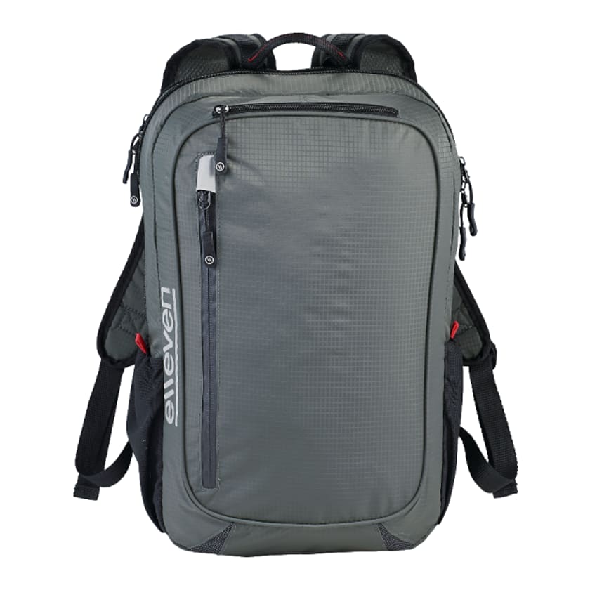 - The elleven™ Lunar Lightweight 15" Computer Backpack series is making travel lighter and smarter. Smaller and lighter devices need a bag that is as innovative as the technology inside. The new elleven Lunar backpack includes the same smart organization and functionality you expect in elleven, but in an ultra-light design with weather-resistant nylon and a waterproof front pocket. Coming in at just 1lb, this bag still has the protection you need. The dedicated rear laptop compartment holds up to a 15.6 inch computer, while the main compartment has a pocket for your tablet or iPad®, as well as pockets for your pens, business cards, and cables. Extra organization in the waterproof front pocket and a mesh slash pocket for a water bottle. Lightweight straps are durable and extremely comfortable. Features a padded mesh back with trolley sleeve. Reflective branding adds an additional safety element to keep you visible at night. Free run charges for embroidery up to 10,000 stitches.