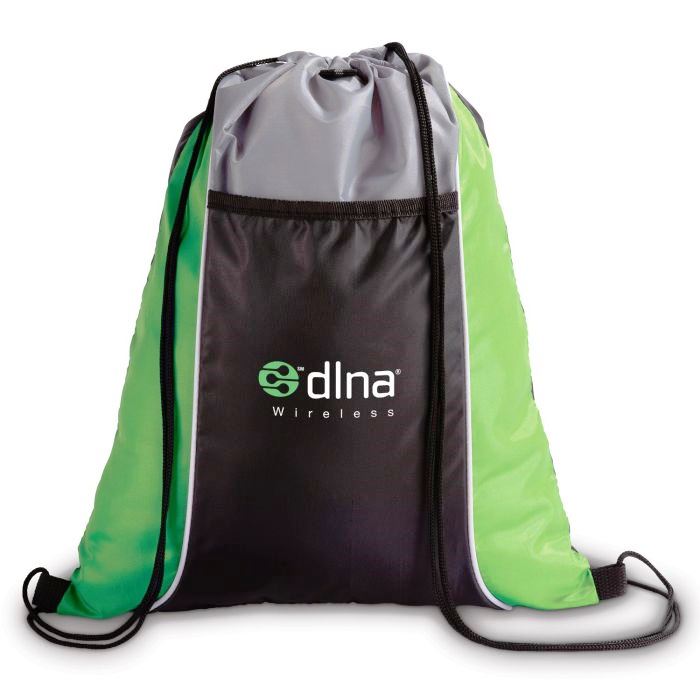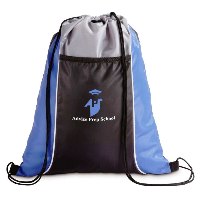 - 210d polyester durable drawstring backpack. Large front pocket. Color blocking with piping.