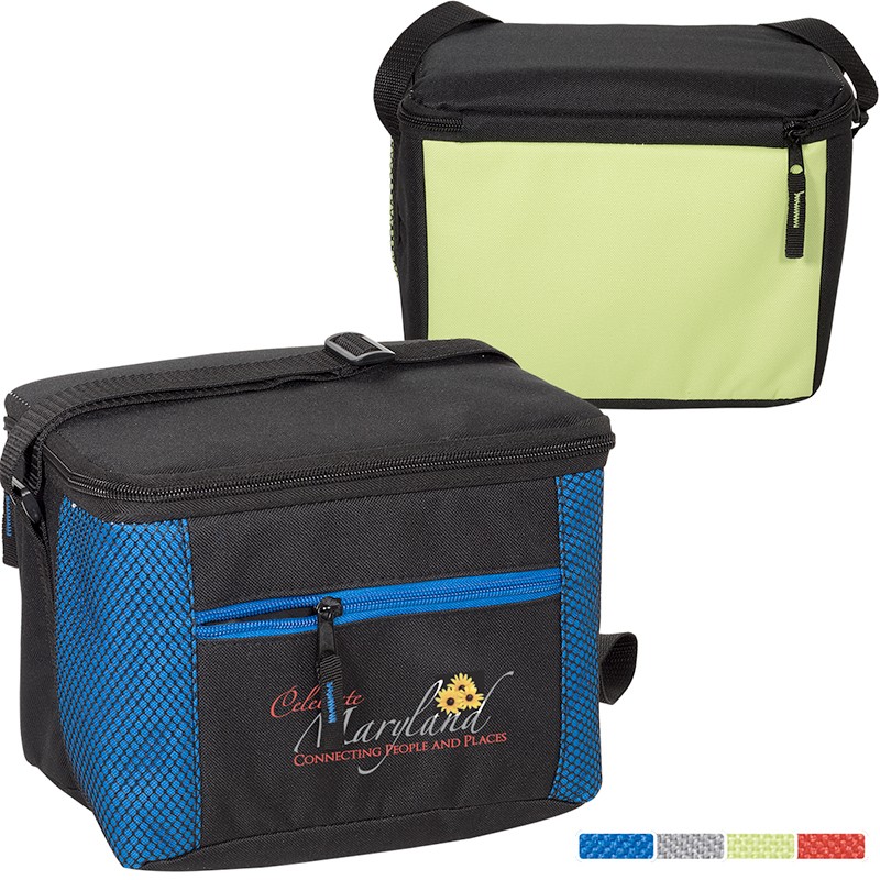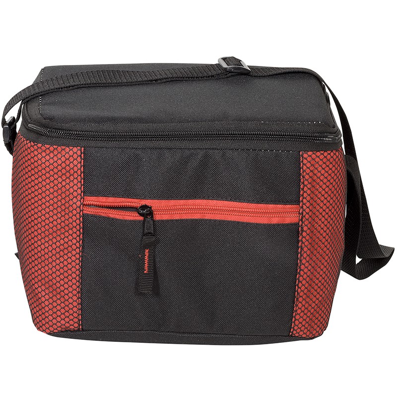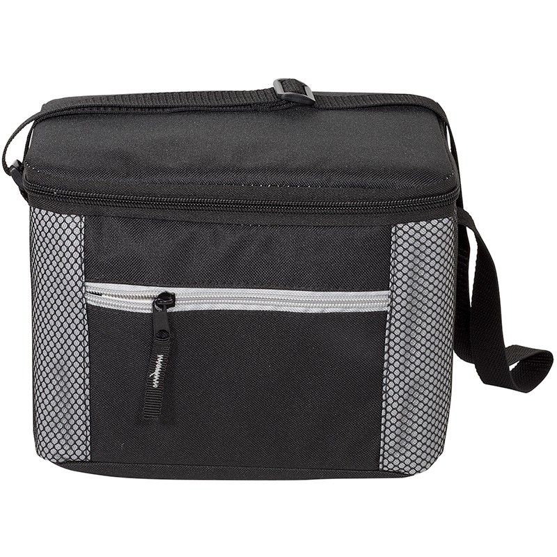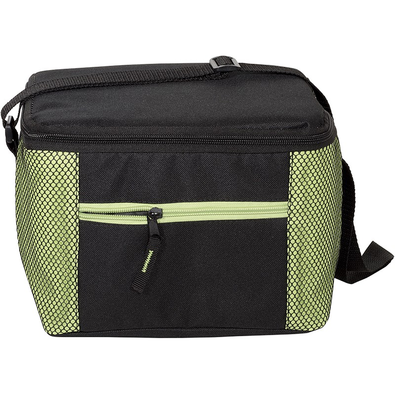 • Insulated lunch bag made of 600D Polyester with PVC backing and Mesh-patterned color accent panels with Aluminum Foil insulated interior.