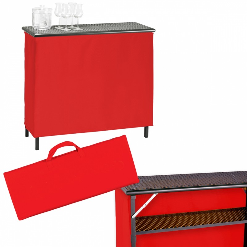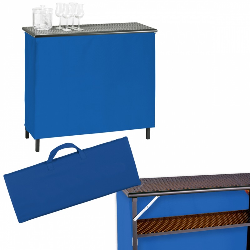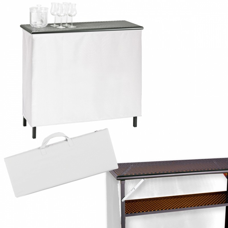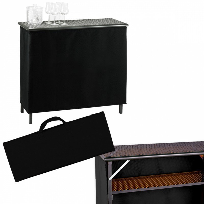 - Everyone knows that snacks and cocktails always draw the crowd! easily create a visible prescence with this Portable Folding Bar. Featuring a sturdy steel construction with drop-down shelf and long polyester skirt, this table sets up and breaks down without any tools and includes a carry case for easy transport. Cheers!