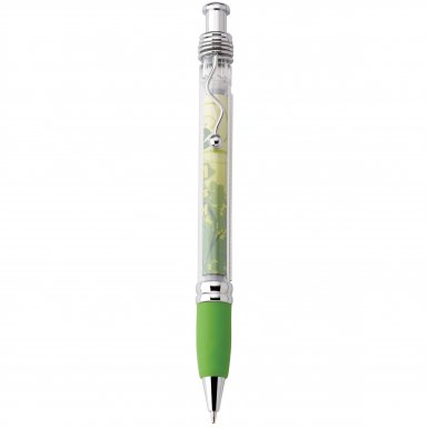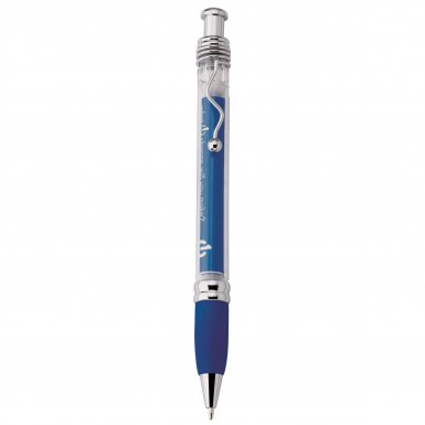 - Plastic with transparent barrel, chrome trim, solid colored comfort grip, push-action pen function and a 611/16"x 2½"customized 4-color process imprint on both sides (banner design not included)