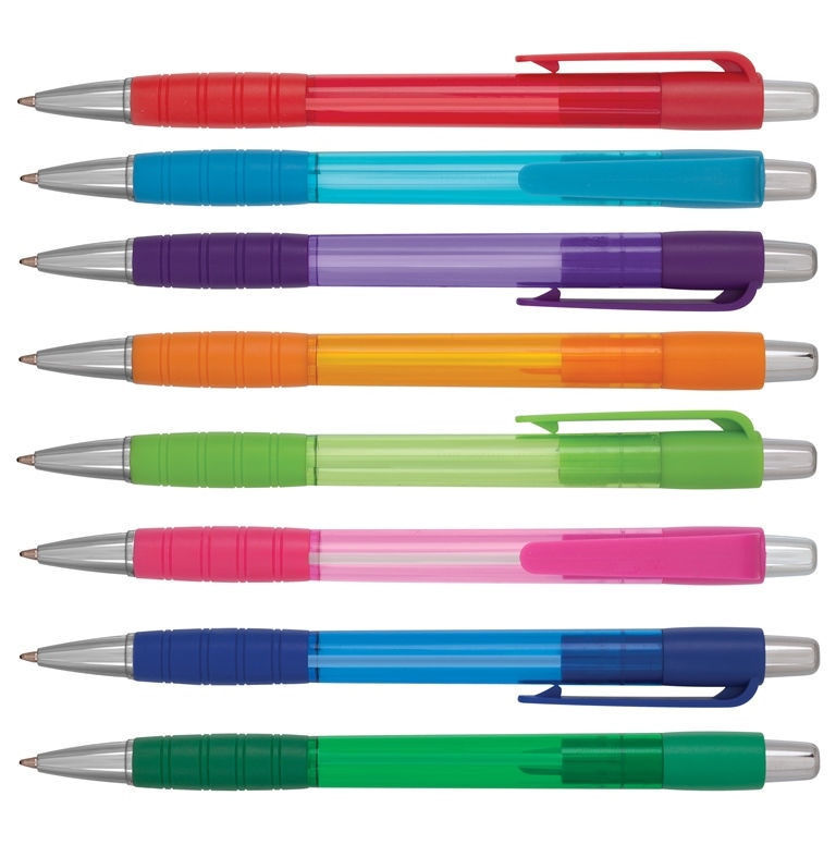 - Translucent corporate colors with a grip make this a great pen for your next promotion!