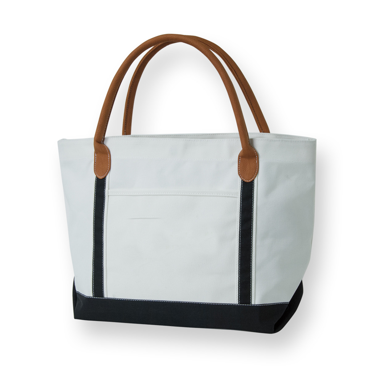 - This customizable tote bag will allow you to “sea and be seen!” This 18 oz. canvas tote bag measures 20? x 13? x 7 1/2? and features a large front pocket for added storage, magnetic top closure and vegan leather handles for a comfortable carry. Great for promotional use, each bag can be customized with a brand name or logo. Cast those promotional nets and reel in some new customers!