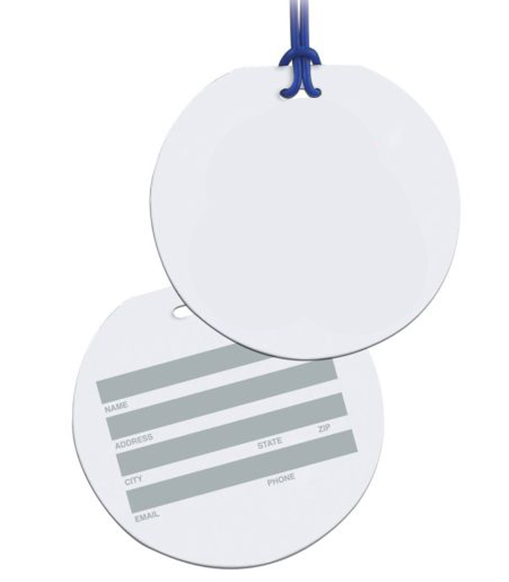 - Heavy-Duty Round Sport/Golf Bag Write-On Surface Luggage Tag. .80 mil thick rigid vinyl sport / golf bag tag with strap. Strap ships bulk, unattached. Tag features standard tinted write on ID surface on back. 100% reusable. Made in USA.