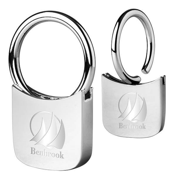 - Metal square key holder with shiny chrome finish; pull-and-turn ring.
